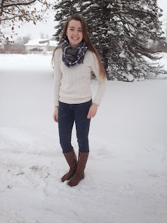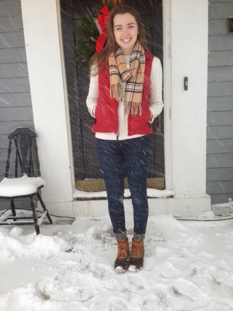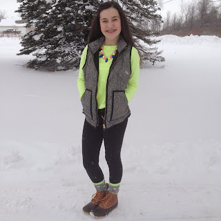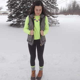 Vest: J crew factory, Sweatshirt: gap, Leggings: Aeropostale, Socks: Gap, Necklace: Delia’s, Boots: L.L. Bean (thanks to Carolyn for letting me borrow them)