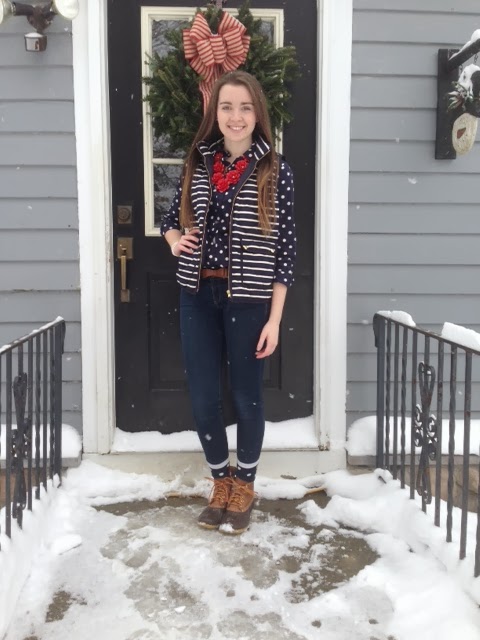 Vest: tj maxx, Scarf: kiosk at the mall, sweater: ralph lauren, necklace: delia’s, Chevron Poppy Clips , Jeans: Abercrombie, Socks: Target, Boots: LL Bean