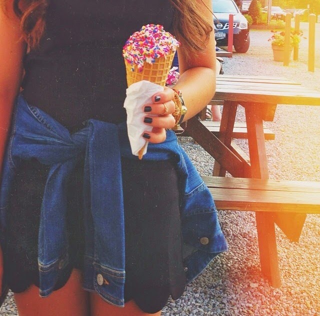 What appears to be happening: I went out for ice cream and snapped the perfect picture of me holding my ice cream perfectly so that you could see my arm party, and my (what I think) adorable outfit.