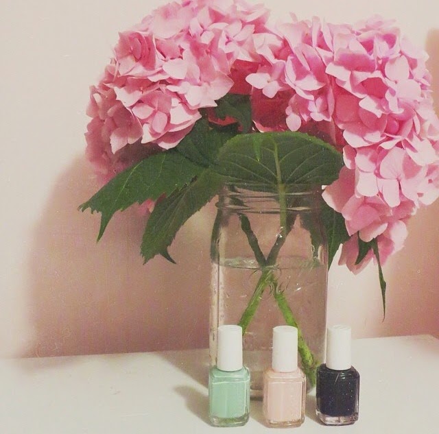 What appears to be happening: I had my 3 favorite Essie polishes sitting next to a mason jar full of some gorgeous pink hydrangeas.