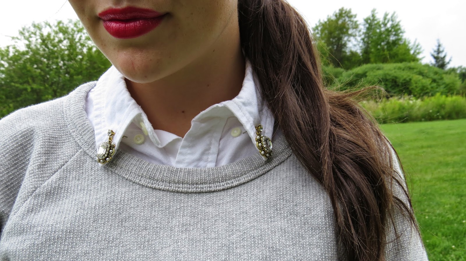 Hey everyone! Today I’m wearing one of my favorite J Crew sweaters over a plain white button down. I added my earring from www.benevolentjewels.com to my collar to add an extra sparkle!