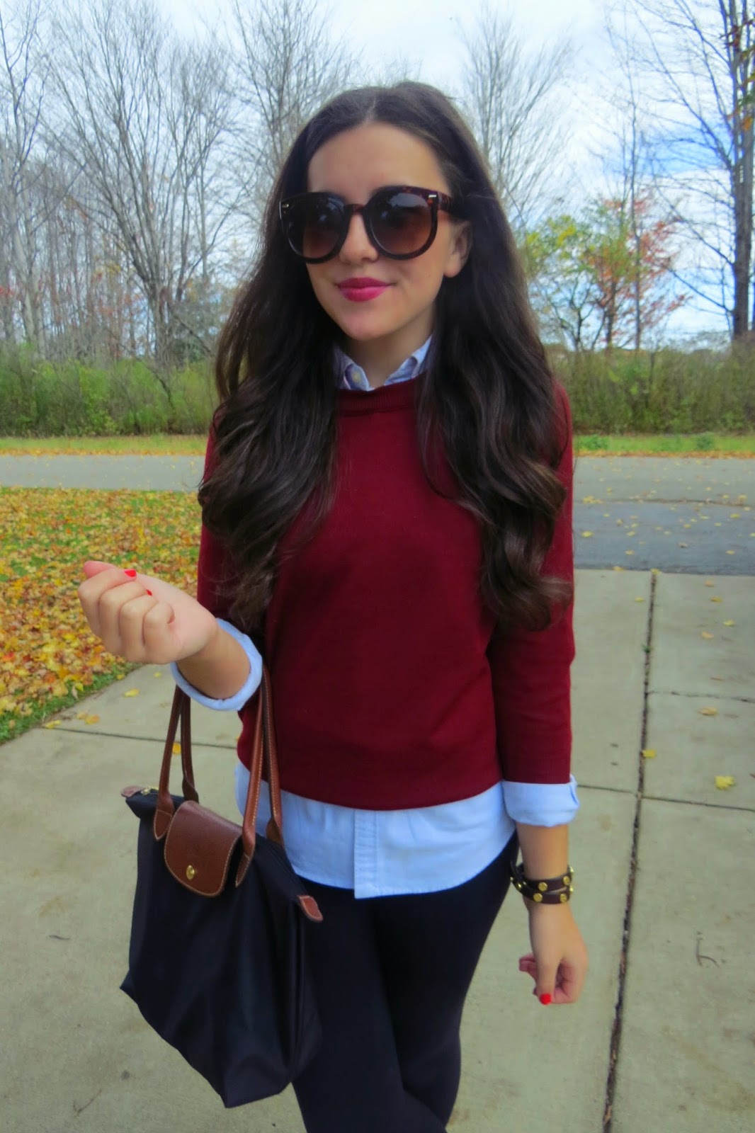 Hey everyone! Today I’m wearing one of my favorite colors for fall. This cranberry color sweater is so cozy and I love putting it with a button down underneath. My friend Carolyn recently wore a cropped sweater with a button down underneath and it looks adorable, thanks Carolyn for the inspo. 😉