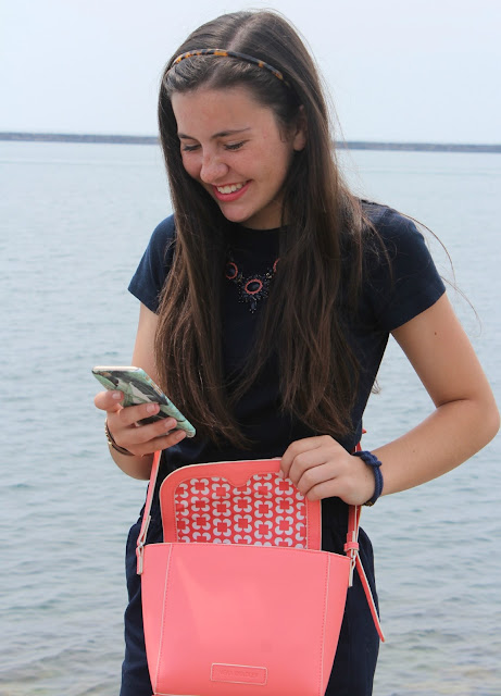 Hey everyone! If you didn’t know by now, navy is definitely a staple color in my wardrobe. Today my outfit is all navy with a pop of coral! This Vera Bradley purse is absolutely adorable, and it’s the perfect summer bag. The size of this cross-body is great, it fits everything you need without being to big or too small. On the interior there is the cutest pattern, which always makes a bag more fun! The purse also comes in 8 different colors, so there are lots of options!