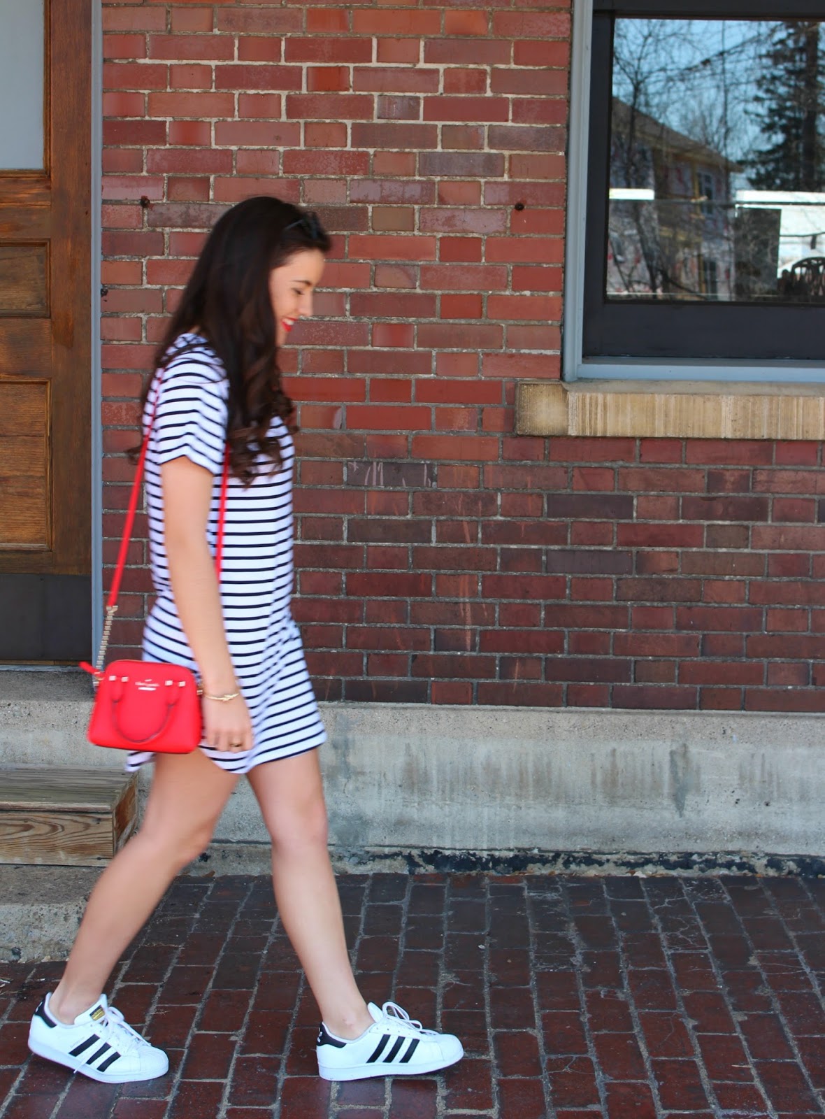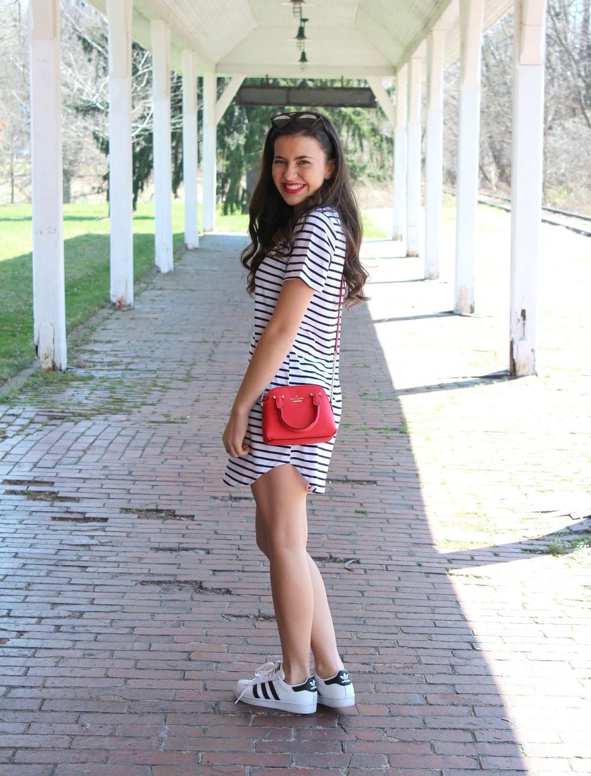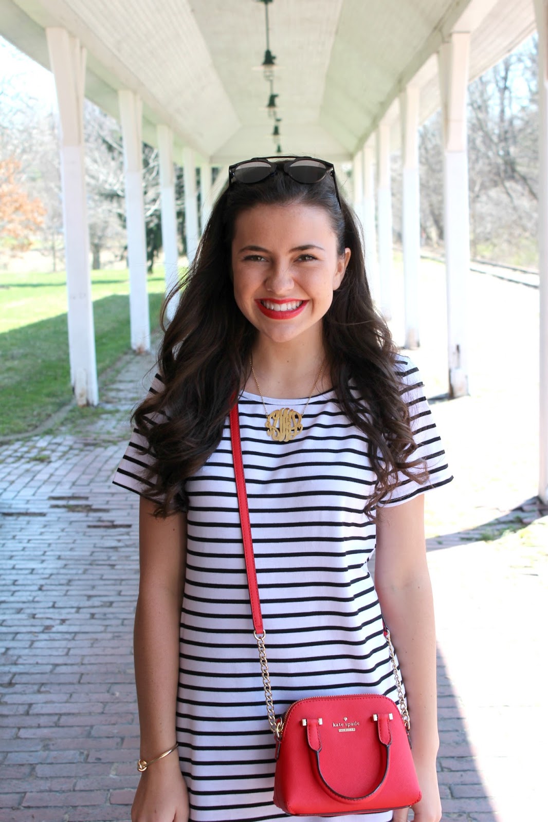 Hey everyone! Happy Saturday! I cannot believe how warm it is today, last weekend I was wearing boots and a down coat, and now I’m wearing dresses and shorts. Hopefully the sun stays! I’m wearing this adorable striped t-shirt dress today, I can’t get over how comfortable it is. The real catch though, its only $12 and comes in two colors! This is a MUST HAVE for summer. It’s super versatile, and is so fun to accessorize. I’m also wearing these Dior look-alike sunnies from www.SheIn.com that are $12.99!