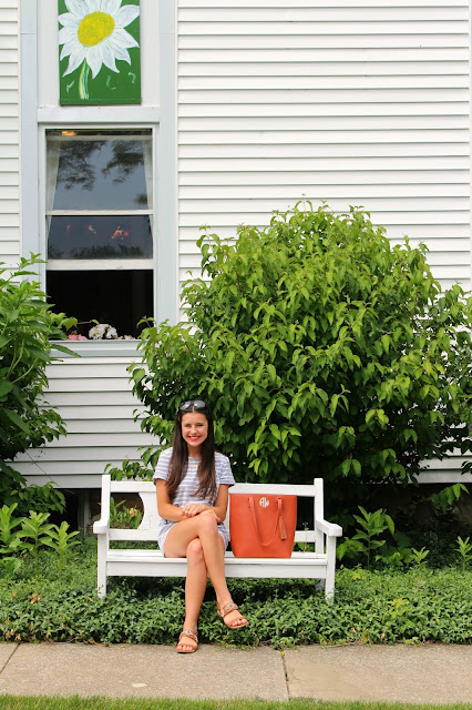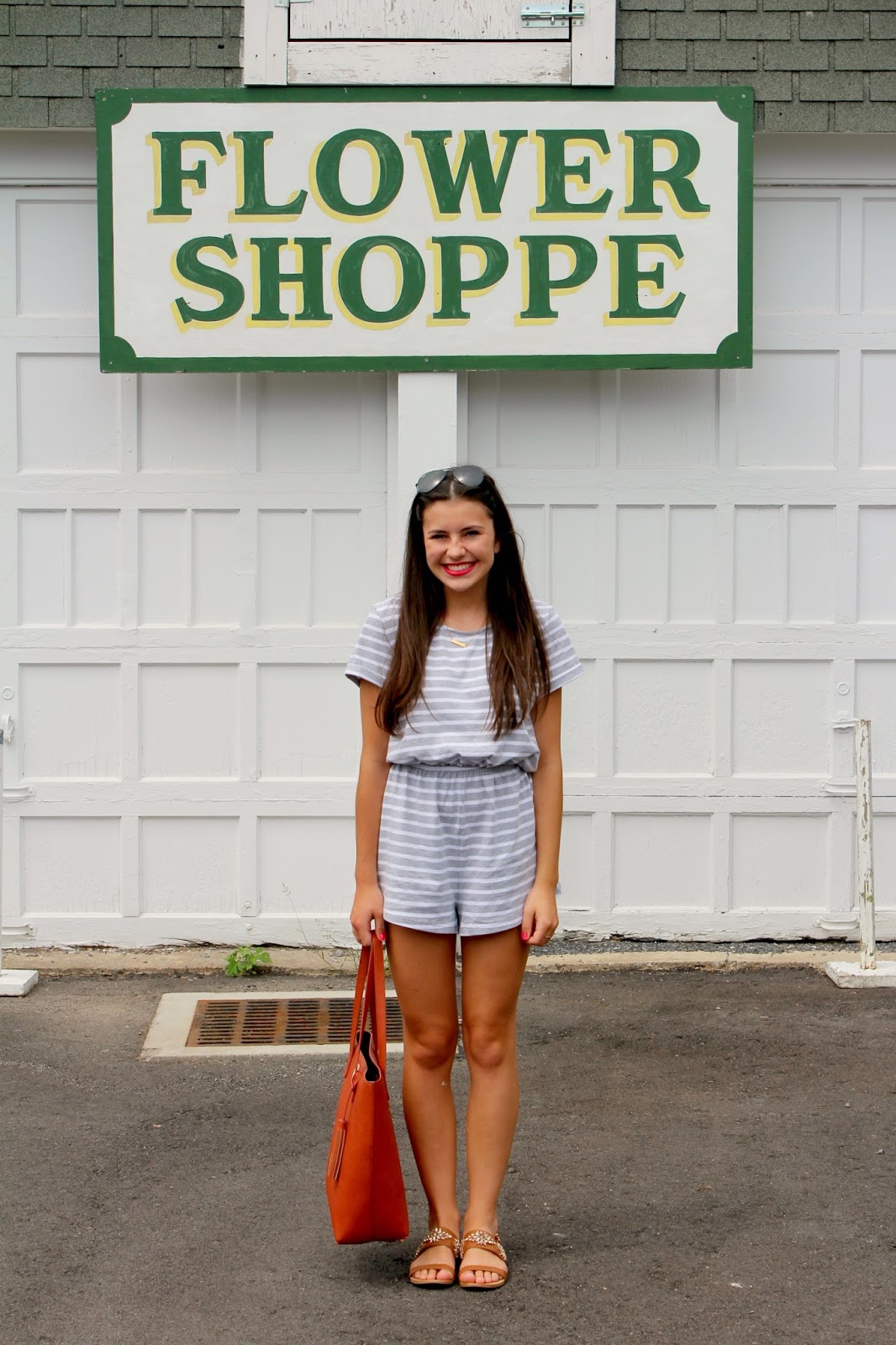 Hi everyone! I hope your summer is off to a great start! During the summer I live in rompers. They are so comfortable, and easy to throw on. Lately the weather has been so hot, and this open back romper was perfect because it’s so lightweight. I paired it with some fun sandals and a big monogrammed tote.