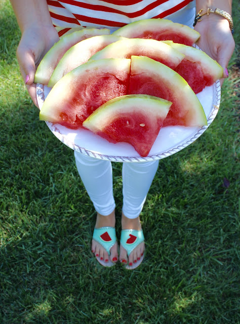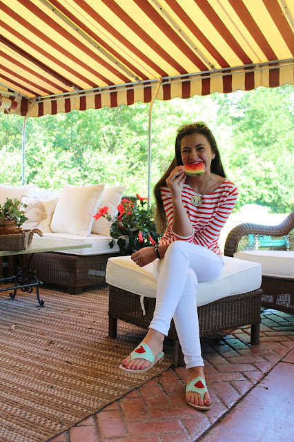 Happy National Watermelon day! I’m celebrating with these super fun sandals from Jack Rogers. They are such fun sandals for summer, and I love the mint green and red combination. Jack Rogers has so many classic sandals, and fun options for the summer. I paired them with some white jeans, and a red and white striped tee.