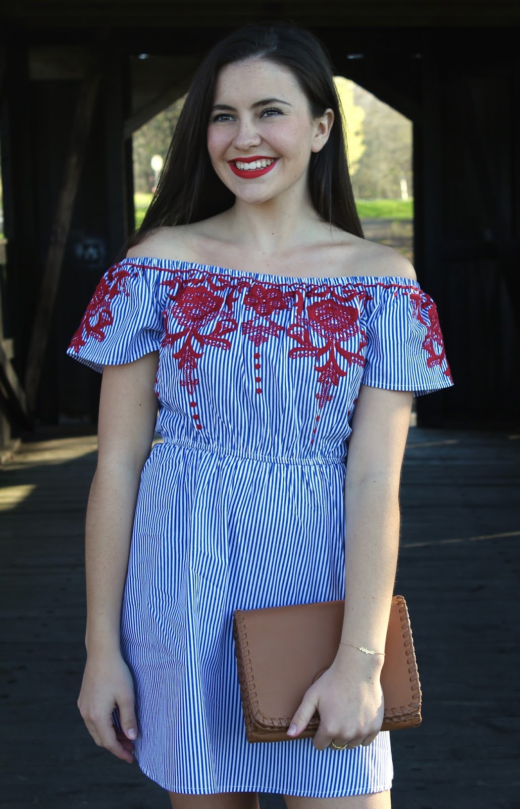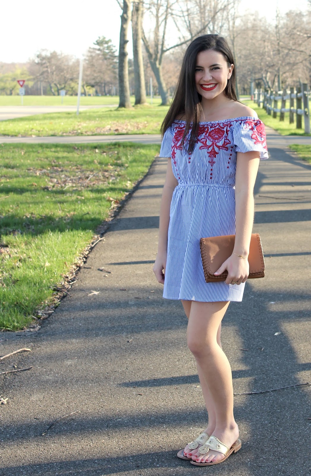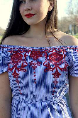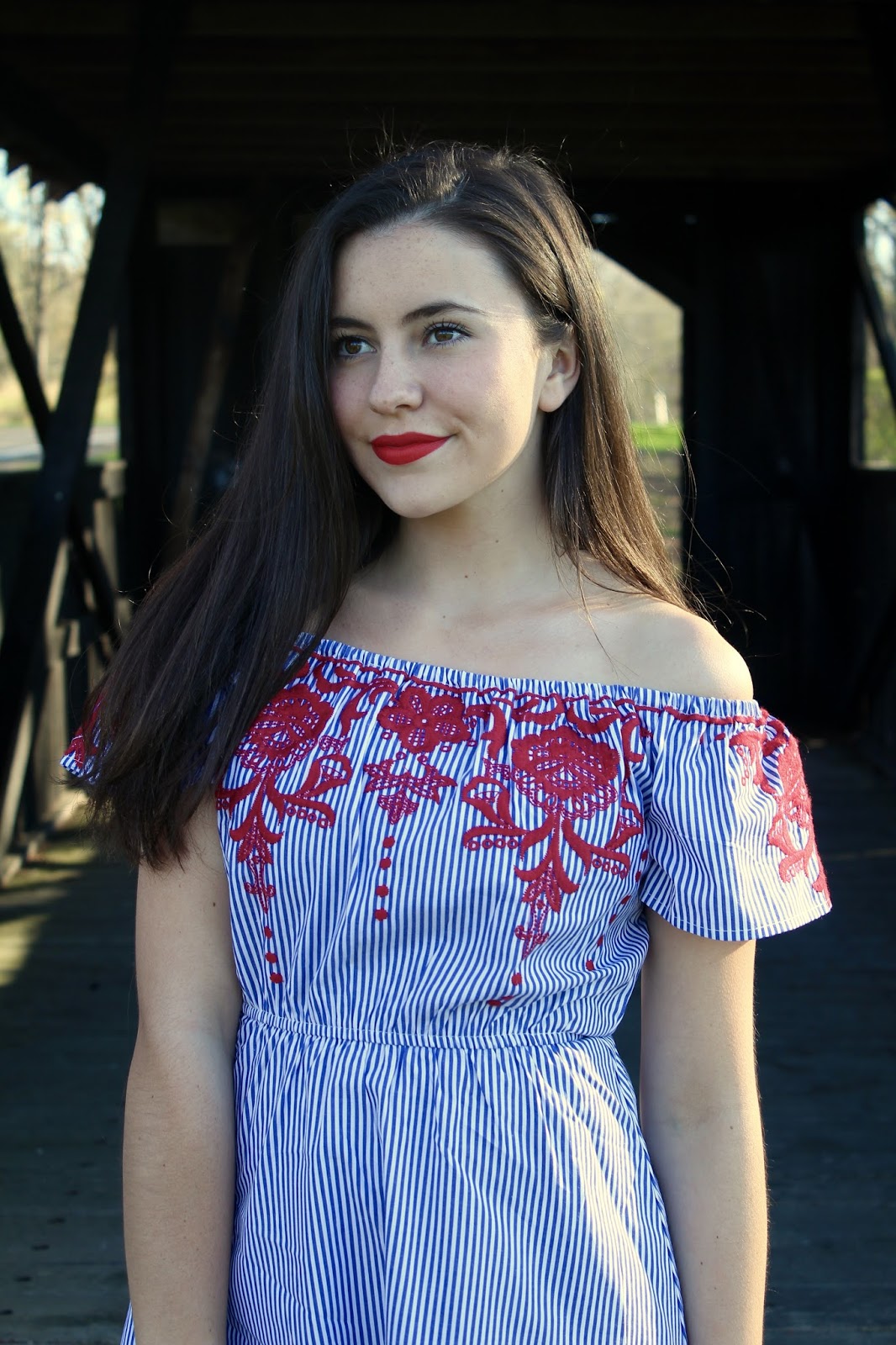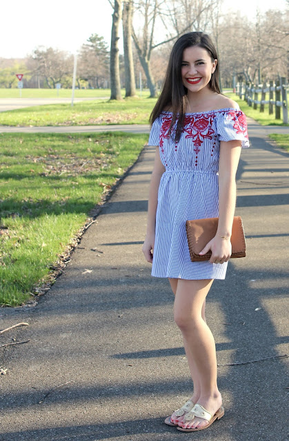 Hi everyone! Long time no post, so sorry I haven’t posted in a while school is keeping me extremely busy! It’s FINALLY starting to feel like, and look like spring outside and I couldn’t be happier. I only have a few weeks left of school- I can’t believe how fast my freshman year flew by. The work load has been overwhelming lately, but all of the blooming flowers and spring weather has been making school a lot better. This weekend I went home to spend Easter with my family, and before I went back to school had a chance to go shopping with my mom! Lately theres been SO many embroidered pieces, and I couldn’t pass up on this dress. I love the red detail, and of course the stripes are too cute!