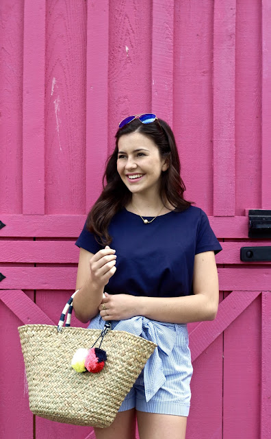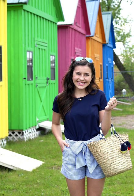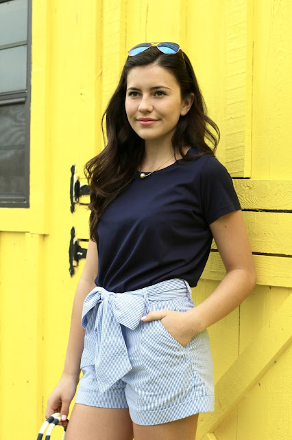 Hi everyone! Happy Tuesday! Lately I’ve been loving these shorts from Lauren James. They are so adorable, the seersucker and bow make the perfect combination. In the warmer months it’s great to have a pair of shorts that you can dress up, or even wear with a simple tee and still look put together. I paired my shorts with a navy tee, and this super cute straw bag!