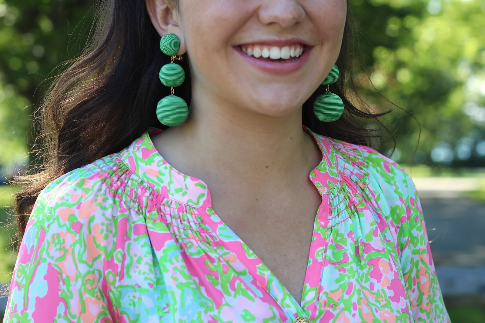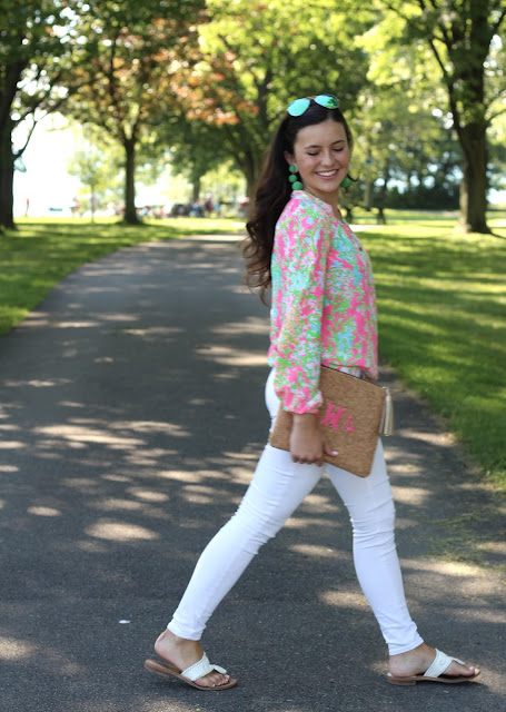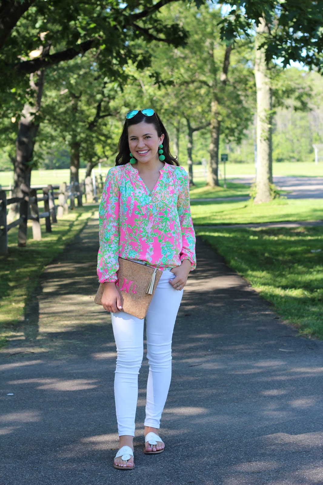 Hi everyone! I’m so excited about this post, I’m wearing my first Elsa Top! I’ve always wanted an Elsa, and was so excited to find this one in my favorite pattern- ‘Southern Charm’. For only $30 I couldn’t say no! I got it from the Instagram shop @ashleyrosehurstcloset – she sells a lot of adorable things at great prices. I’ve also been loving my cork clutch from Carolina Clothing Company, it goes with everything! How fun are these KEP designs pom pom earrings– I’ve been loving adding a pop of green to my outfits lately!