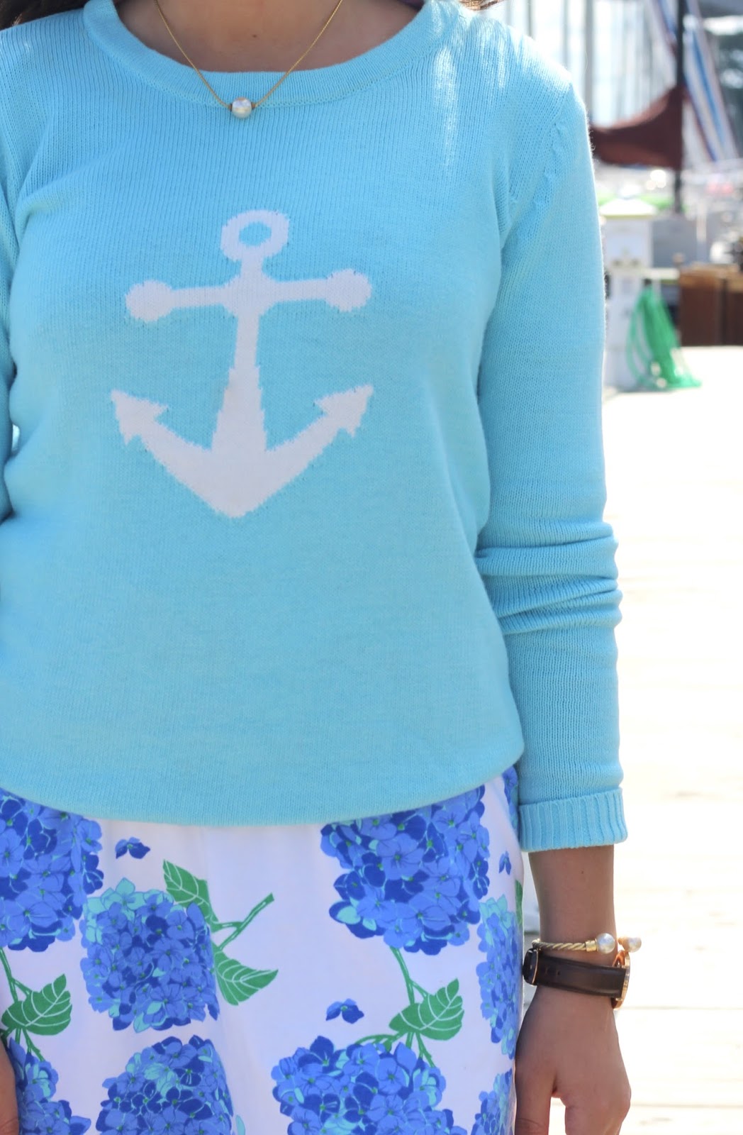 Mahi Gold couldn’t be any cuter. I love the combination of the bright blue hydrangeas, on the white dress with a pop of green. I paired the dress with this adorable anchor sweater from Pink Pineapple Shop.