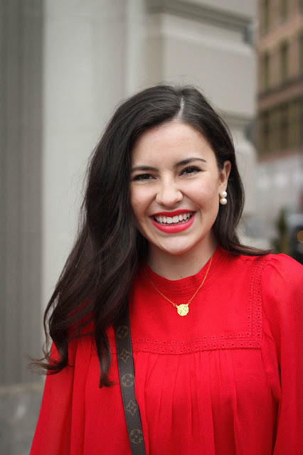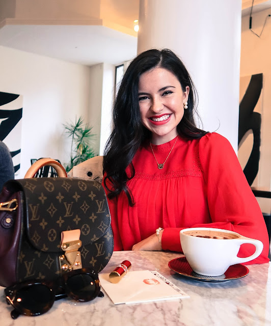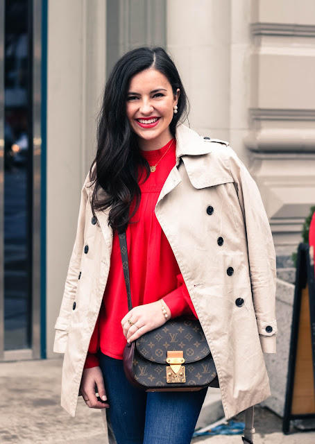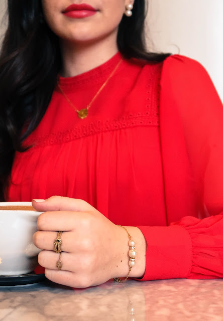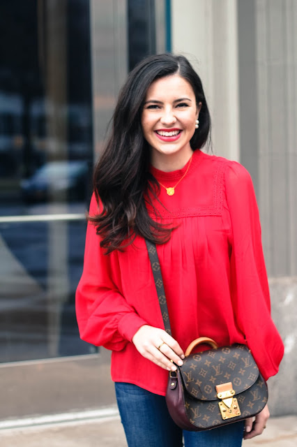 Hi everyone! Today I’m sharing an outfit that’s perfect for a casual Valentine’s Date. I found this adorable blouse at Gap (for an amazing deal), it’s different than what I generally wear but I love how flowy and feminine the top is. I paired it with some of my favorite simple jewelry pieces, and this gorgeous bag from