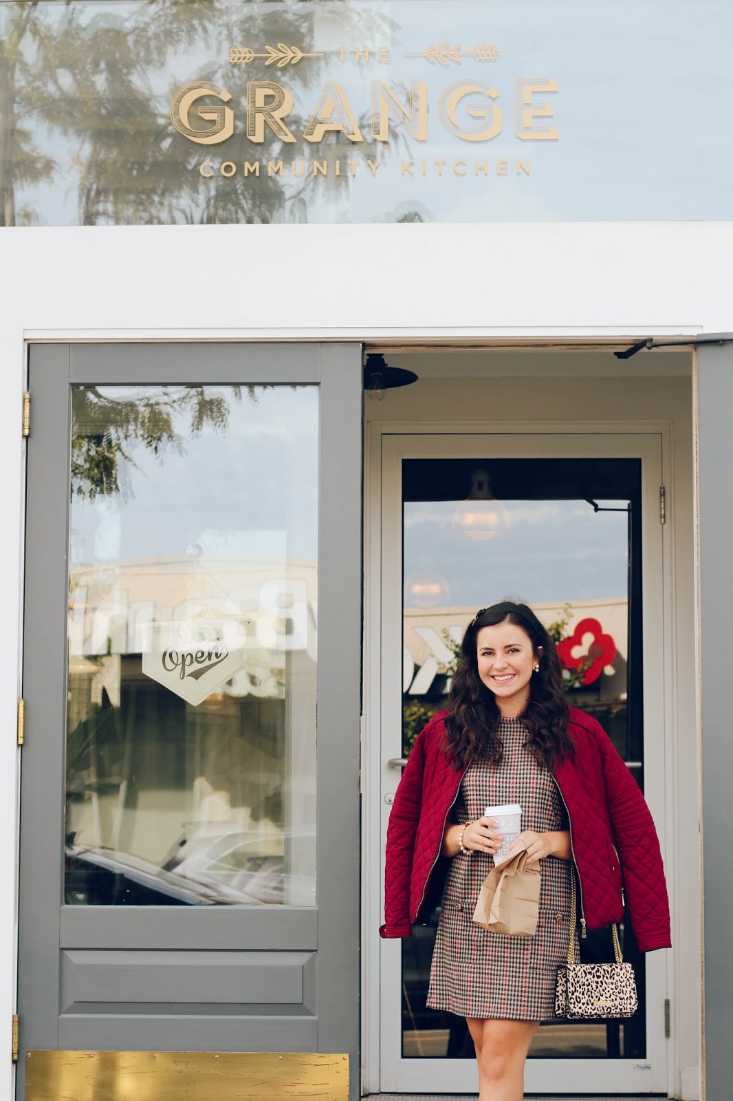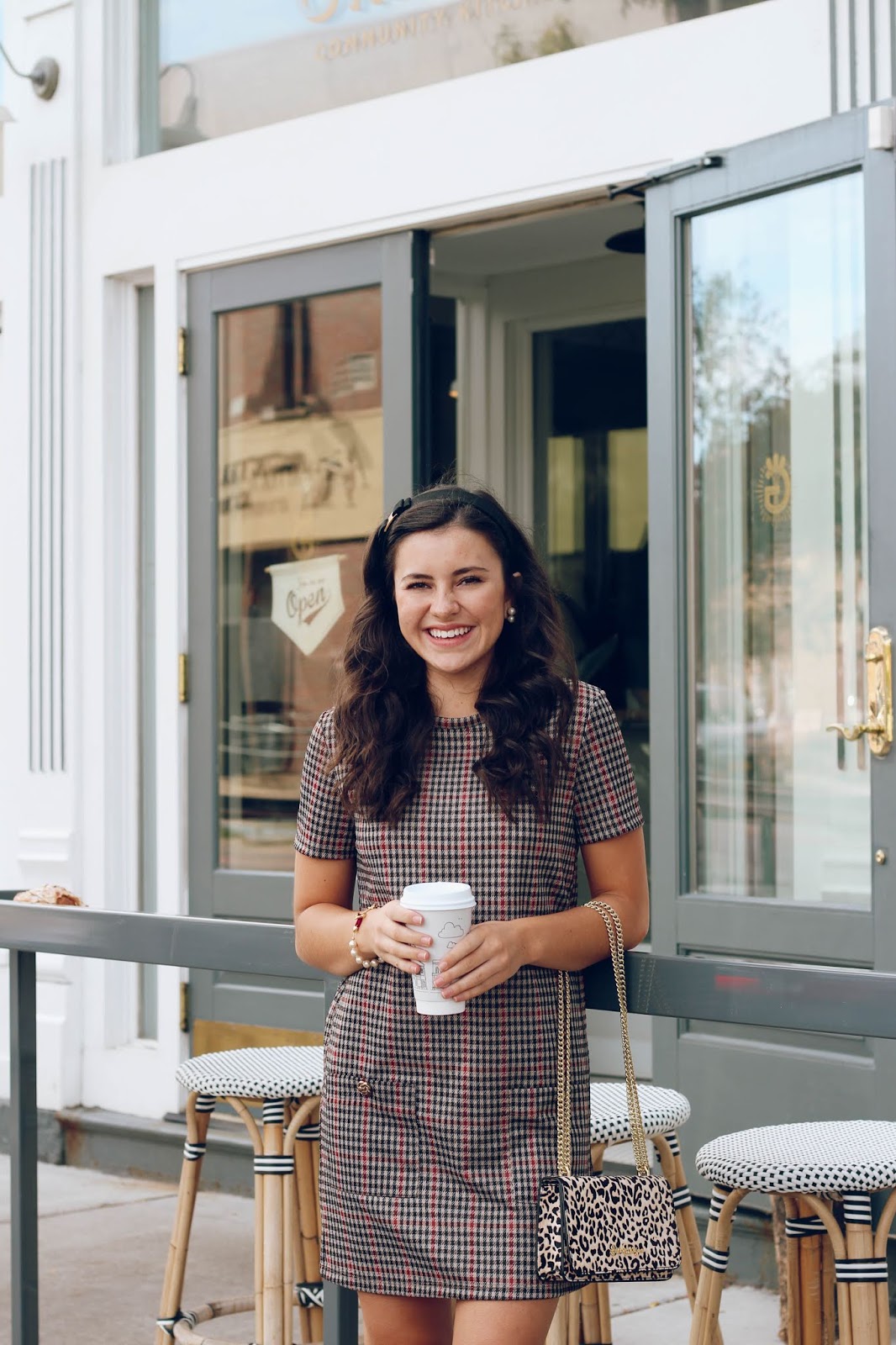 Hi everyone! I loved being home for fall break and going to all of my favorite spots at home. My mom and I grabbed a coffee at one of my favorite restaurants, The Grange Community Kitchen. They always have the best pastries and seasonal drinks. I picked up this dress at Zara over the weekend, it was only $30 and so comfortable! I paired it with a pair of penny loafers, quilted jacket, and added a pop of leopard with my bag. Can you believe my purse is Lilly Pulitzer? It’s such a great bag for fall! I also wore this adorable Ferragamo headband that I scored on Poshmark a few months ago- its such a classic look.