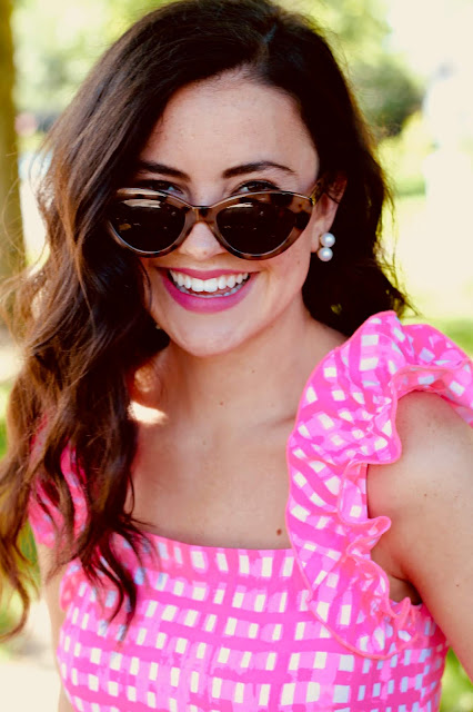 Hi everyone! I always spend the summer in dresses and love looking put together, but still comfortable in the heat. This dress is the best since it has a skort and is made of the perfect stretchy material. I also love the bright pink gingham to switch it up from my usual navy gingham. I paired the dress with this adorable Lilly PulizterĀ bag, the bamboo handle is too cute. Everything I’m wearing is linked at the end of this post!
