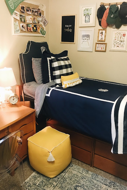 Picking neutral bedding is always a go-to for me! Rather than going with a print in my duvet, I always stick to something simple so I can use it from year to year. Navy and white is a color palette I always find myself drawn to, especially because it pairs so well with other colors. Choosing a simple color palette for bedding makes it a lot easier to utilize it from year to year. I add prints and color in things like throw pillows, sheets, and wall art. Another way to make your space feel cozy are faux headboards. They always look great in any space and make a dorm feel like home.