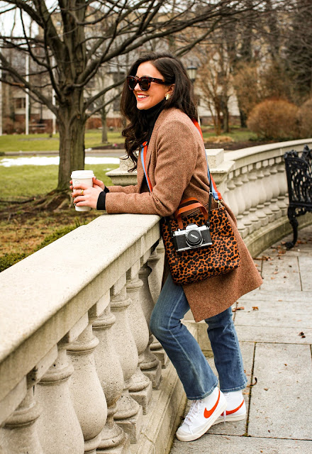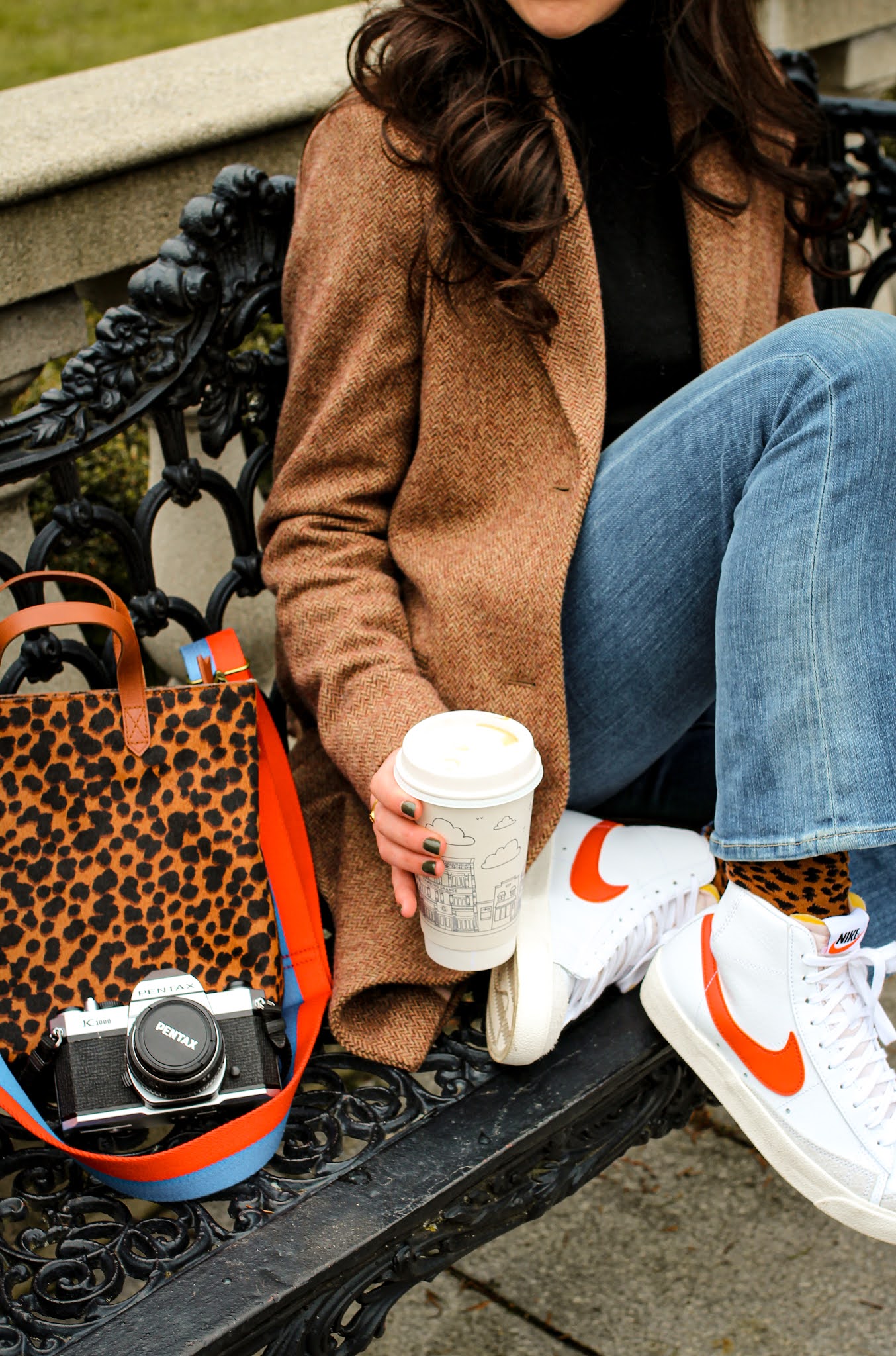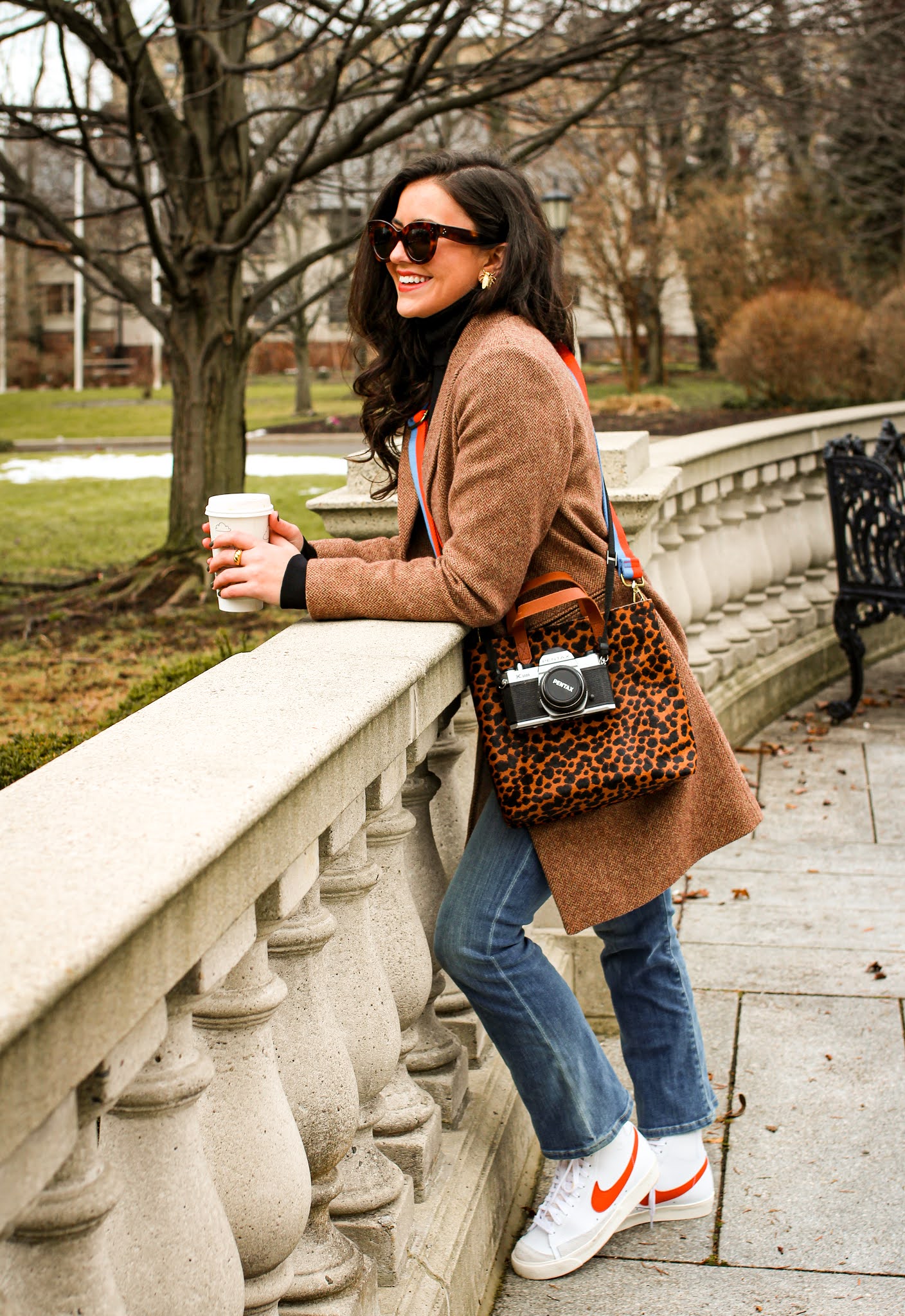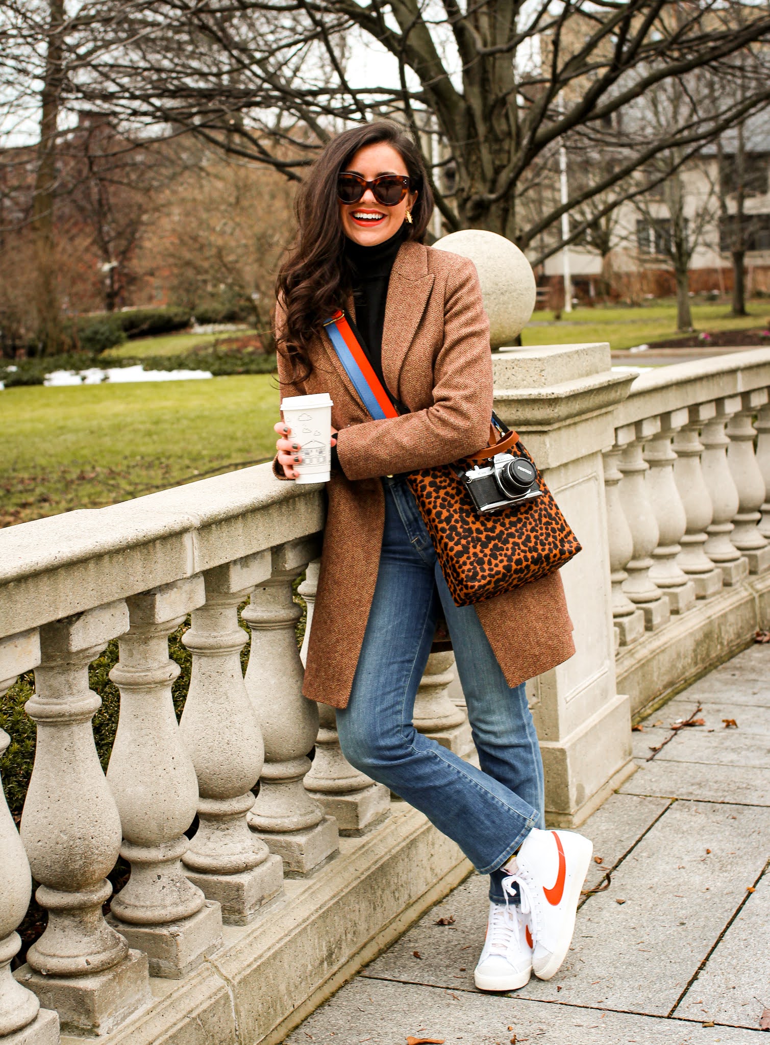 Typically I feel like I play it pretty safe with my style, but in 2021 I want to start trying new things and step out of my comfort zone. I recently bought these Nike Blazers and couldn’t love them more. I think they have such a fun vintage look and I love the pop of color. I paired them with a pretty simple outfit and this fun leopard bag.