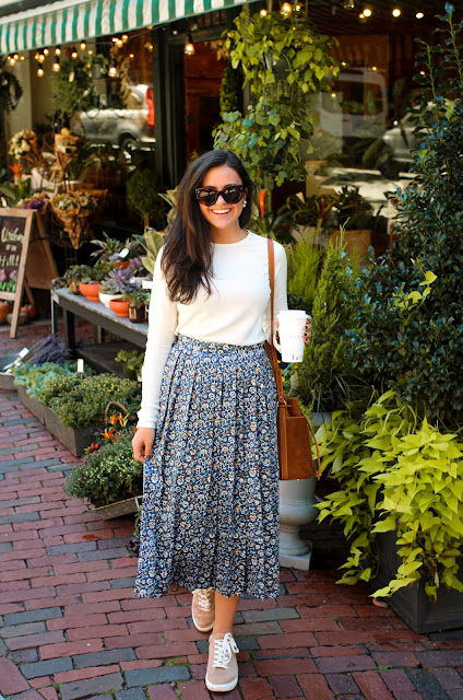I used to think that being 5’2 I was too short for a midi skirt to be flattering, but then I found some adorable silk options that have become some of my favorite skirts in my wardrobe. This floral print from J. McLaughlin has an amazing color way and can be worn so many ways. While we walked around Beacon Hill in Boston, I opted for a more casual look pairing the skirt with suede sneakers and a neutral top. It can easily be dressed up with some heels for dinner too which is great.